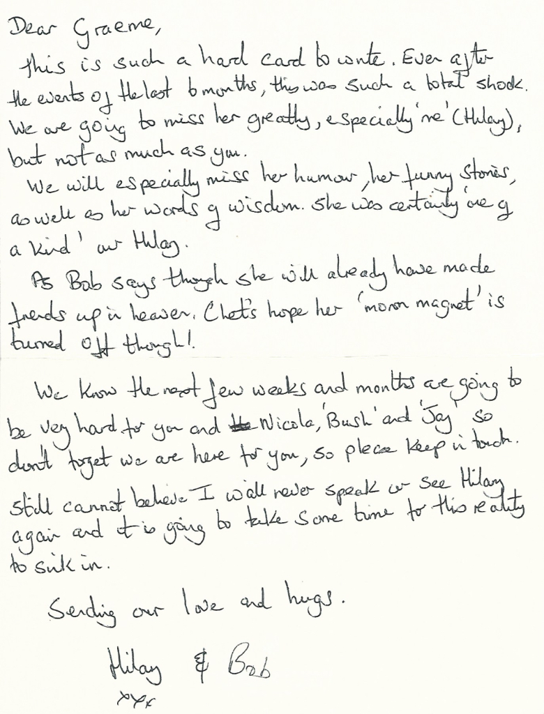 I’m really sorry to hear this Graeme. Hilary and her wonderful laugh and sense of humour and stories were very, very special. Sending you all lots of love x
