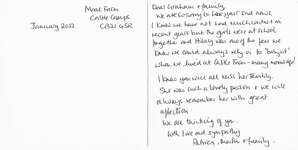 On Friday, 18th February 2022 Hilary’s family and over 100 of her friends congregated in All Saints’ Church, Castle Camps to pay their last respects and celebrate the life of Hilary Gibson, before witnessing placing her in her final resting place. We had friends from Scotland, Cornwall, Manchester and many others travelled far in the face of one of the worse storms in decades. With the church packed to pay their last respects, with standing room only, we demonstrated how much love people had for Hilary.