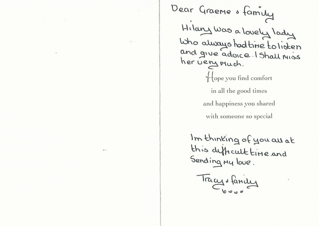 I am so sorry for your loss Hilary was a lovely lady our thoughts are with you x