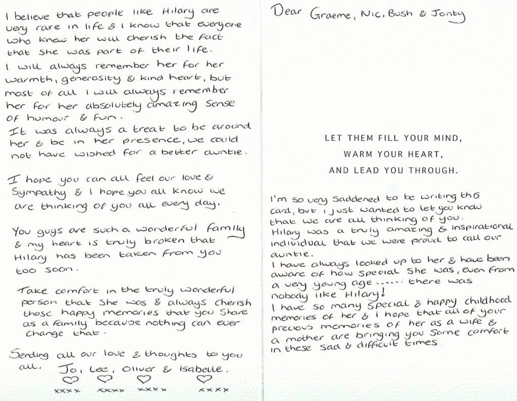 Absolutely Heartbreaking news Graeme I’m so sorry for you loss Hilary was such a special beautiful lady with a heart of gold. Amazing mother who will be missed by all, sending our love to you , Nicola, Bush and Jonty ❤️